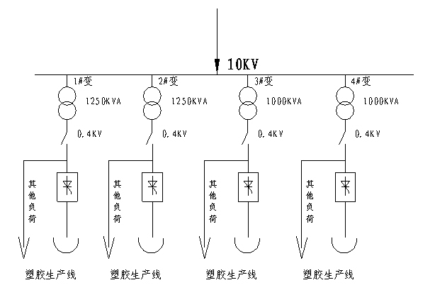公司由一路10KV進(jìn)線,廠內(nèi)安裝1250KVA整流變壓器2臺,1000KVA整流變壓器2臺,均為10KV/0.4KV。4臺整流變壓器分別帶4條塑膠生產(chǎn)線,如下圖: